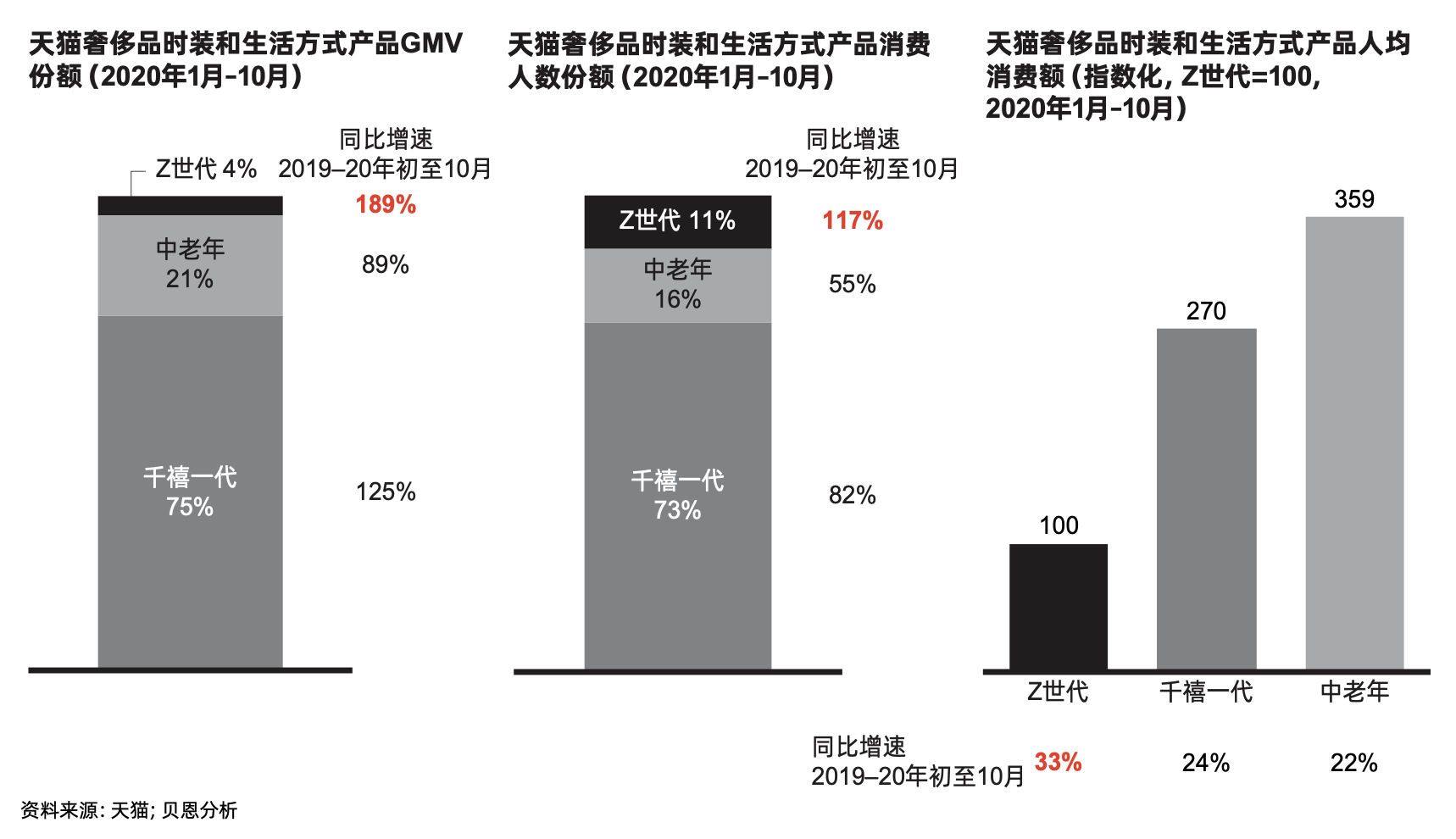 以天猫奢品的时装和生活方式产品品类为例,从今年初到10月,无论是在消费人数还是GMV上,千禧一代都占到该品类的70%。 尽管Z世代对该品类GMV的贡献目前还不到5%,但今年该人群的数量同比增速超过100%,相应的GMV同比增速更是突破150%。此外,随着年轻一代进入职场、收入增长,Z世代的年人均消费额预计将会迎头赶上。