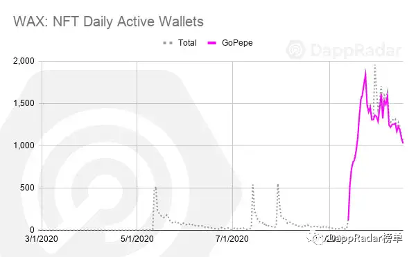 作为获取流量的“捷径”,区块链创业者们其实已经在积极出圈引入一些有影响力的IP。如基于EOSIO开发的WAX链,今年曾引入著名美国漫画形象pepe蛙,发行GoPepe系列卡牌。据DappRadar数据显示,截至2020年第三季度末,GoPepe拥有超过1,300个每日活跃钱包,交易额达到8.1万美元,占该类别总交易量的90%。