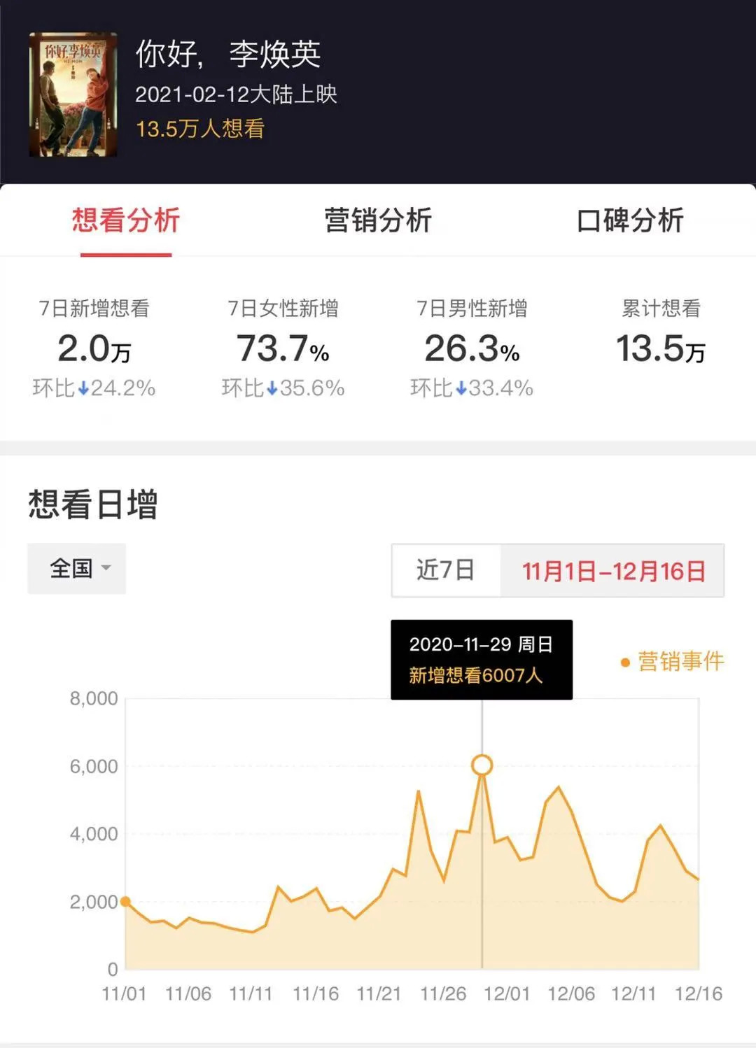 在诸多利好因素影响下,这部临近11月才正式定档的作品尽管是姗姗来迟,却迅速触达到各类观众人群,在猫眼平台上几乎每天都能维持着破千的想看新增,日增稳定处于第一梯队。