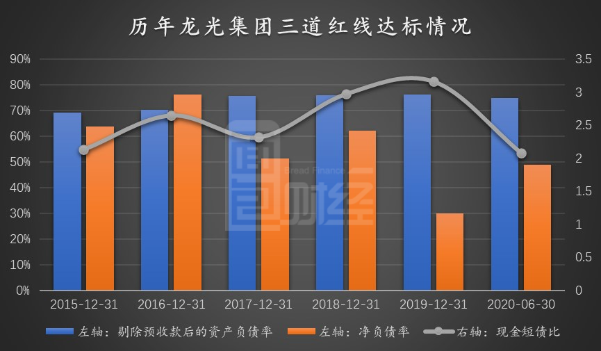 截至2020年6月末,龙光集团剔除预收款的资产负债率为74.96%,略超监管指标;净负债率为48.94%,符合监管要求;现金短债比为2.09倍,符合监管要求,财务归属“黄色”阵营。
