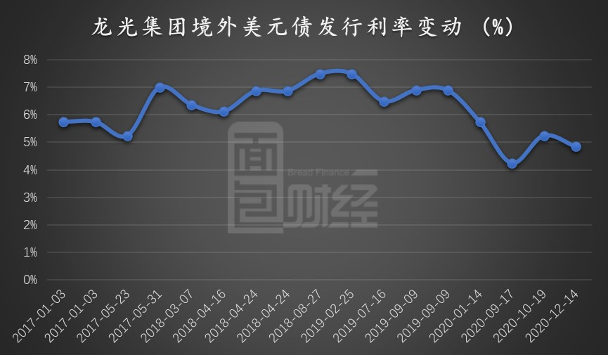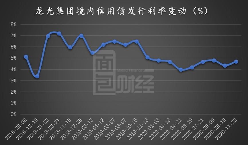 2020年1-11月,龙光集团发行的境内信用债和境外美元债平均票面利率为4.53%和5.03%,相比2019年回落1.57和1.93个百分点;平均发行期限分别为3.38年和5年,其中境外美元债平均发行期限比2019年拉长0.75年,境内信用债平均发行期限与2019年基本持平。综合来看,2020年以来,龙光集团境内信用债、境外美元债发行利率回落、同时久期拉长。