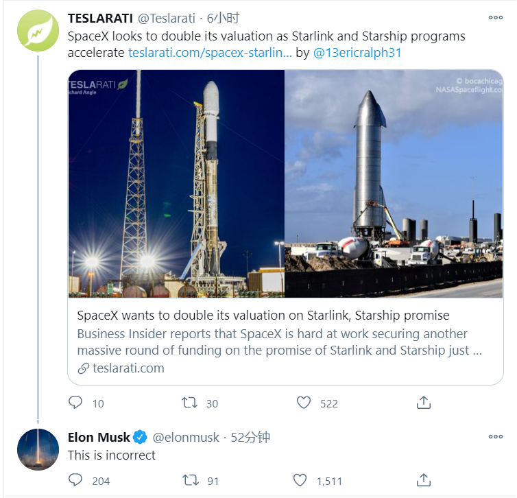 12月17日,马斯克在其个人推特发文称,Business Insider 此前对SpaceX估值的报道失实。