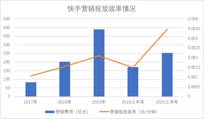 作为一家贩卖流量的平台,在2019年之前快手的变现效率是不断提高的,这也是平台流量集中效应的结果,但在2020上半年,该数字却有了一定的回调,该期间快手市场费用几乎占到了总营收的一半,甚至不惜牺牲本具有优势的增长效率,不惜牺牲营收效率下降的风险。