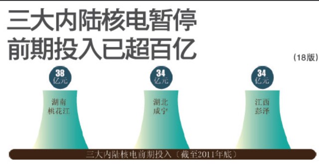 以湖南桃花江核电站为例,按照规划,桃花江核电项目总投资约670亿元人民币,这不仅是益阳市最大的投资项目,也是湖南省有史以来投资最大的一个工程。根据记者不完全统计,桃花江核电站在主体工程开工前,前期投入已近40亿元人民币,目前因为设备维护、留守员工工资等支出一直在持续增加。其停工造成的土地闲置、经济下滑、就业安置等间接损失更难估算。