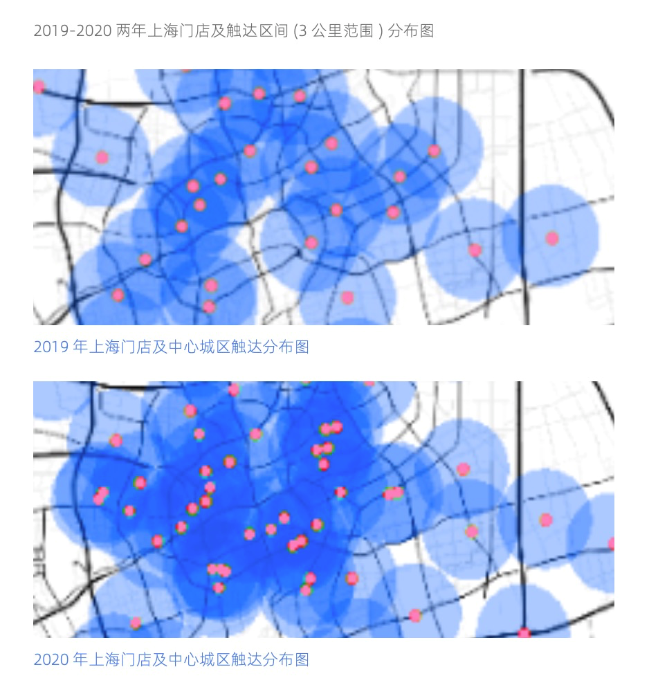 盒马在“诞生之城”发展迅速,无论在覆盖广度还是覆盖交叉深度方面,上海盒区房扩张趋势非常明显,且不断孵化多种业态。上海市中心城区覆盖率可达93.2%,居全国首位,环比去年增幅97%,假定趋势无显著变化,未来上海的“盒区边界”会消失。而上海作为样本城市,也代表了未来盒马在全国的发展趋势。