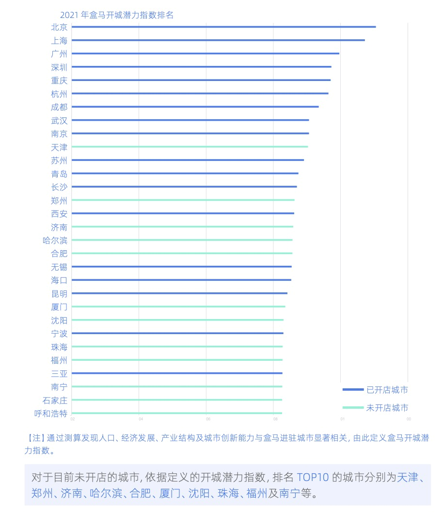 贝壳研究院通过分析盒马的进驻城市,发现开城与人口、经济发展、产业结构和城市创新能力等多种因素相关。因此推测未来入驻排名前十的城市为天津、郑州、济南、哈尔滨、合肥、厦门、沈阳、珠海、福州及南宁等。