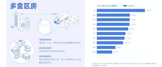 盒区房原指盒马鲜生门店的配送范围内的楼盘小区,近年盒马又孵化盒小马、x会员店等多种业态,多盒区房概念应运而生。贝壳找房通过分析全国23个城市发现,除考虑到商业分布外,盒马门店分布与小区的空间分布表现较强一致性,上海覆盖率最高、西安弯道超车深圳成为全国第二,而武汉、长沙、南京、杭州、成都等新一线城市在城市创新,产业结构等软实力发展迅猛,近年来盒区覆盖率显著提高。