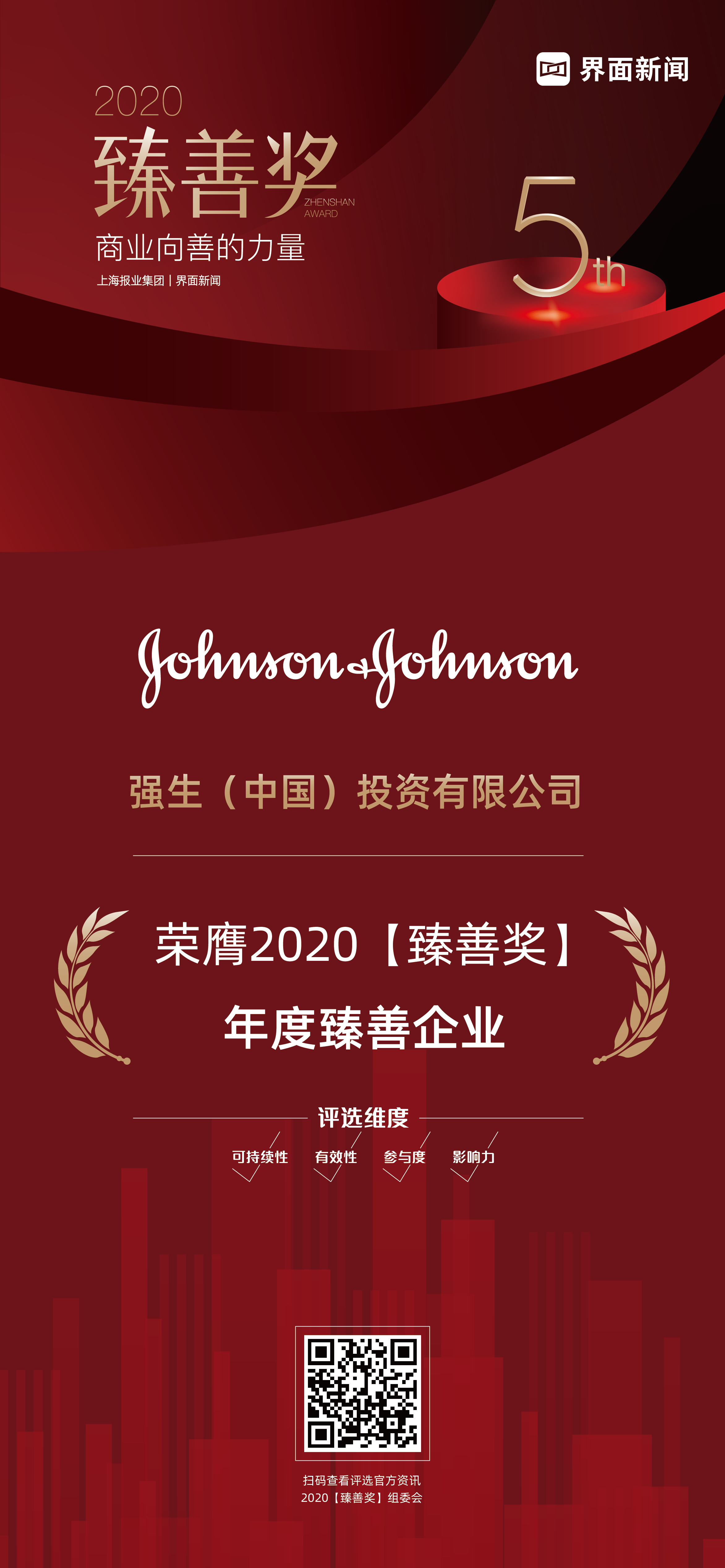 12月22日,上海报业集团l界面新闻在上海静安瑞吉酒店举办了2020【臻善奖】颁奖典礼,并正式公布了本年度获奖名单。围绕商业向善这一责任旨归,在公益慈善领域有所贡献的优秀企业踊跃参加。强生中国以卓越的CSR实践精神,荣膺年度臻善企业大奖。