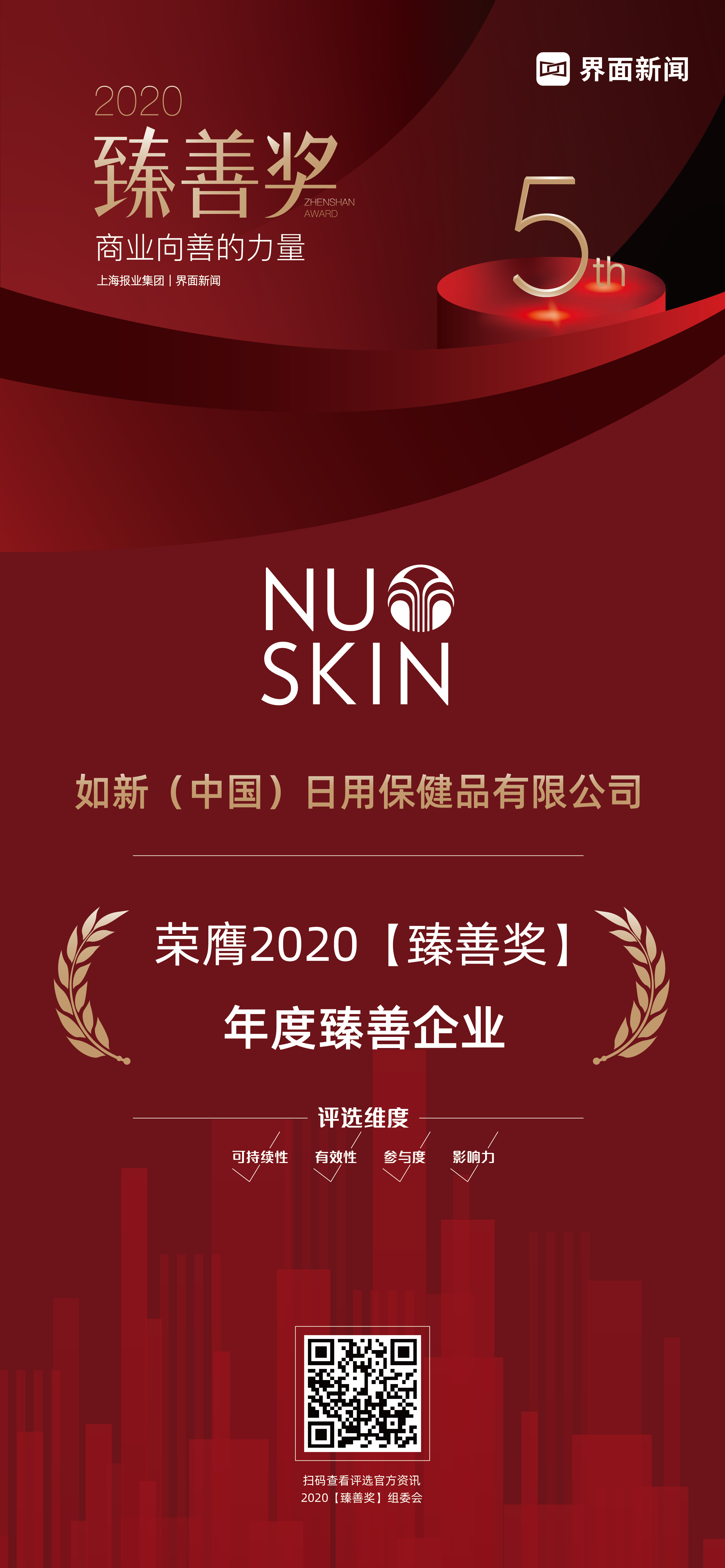2020【臻善奖】通过界面新闻在财经媒体中的领先影响力,以商业向善为责任旨归,挖掘为社会带来经济势能的同时,提供公益势能,传递正能量的企业和个人。评选聚焦寻找CSR的企业榜样,着眼企业在疫情防控以及中国实现全面建成小康社会过程中做出的贡献,鼓励企业承担起作为社会发展中坚力量的广阔责任。
