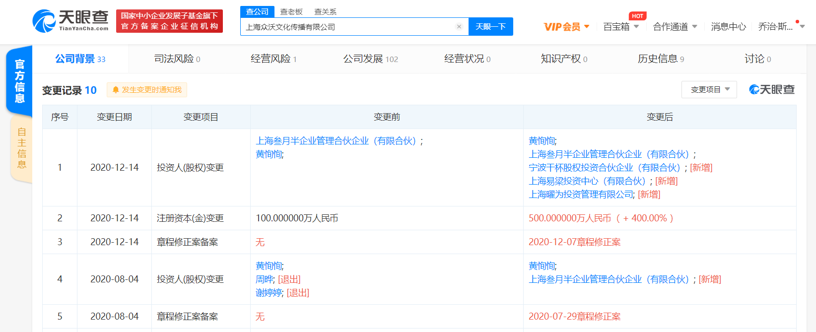 据天眼查APP显示,12月14日,上海众沃文化传播有限公司发生工商变更,新增股东宁波干杯股权投资合伙企业(有限合伙)、上海易梁投资中心(有限合伙)、上海曜为投资管理有限公司。此外,公司的注册资本也从100万人民币增至500万人民币,增幅为400%。