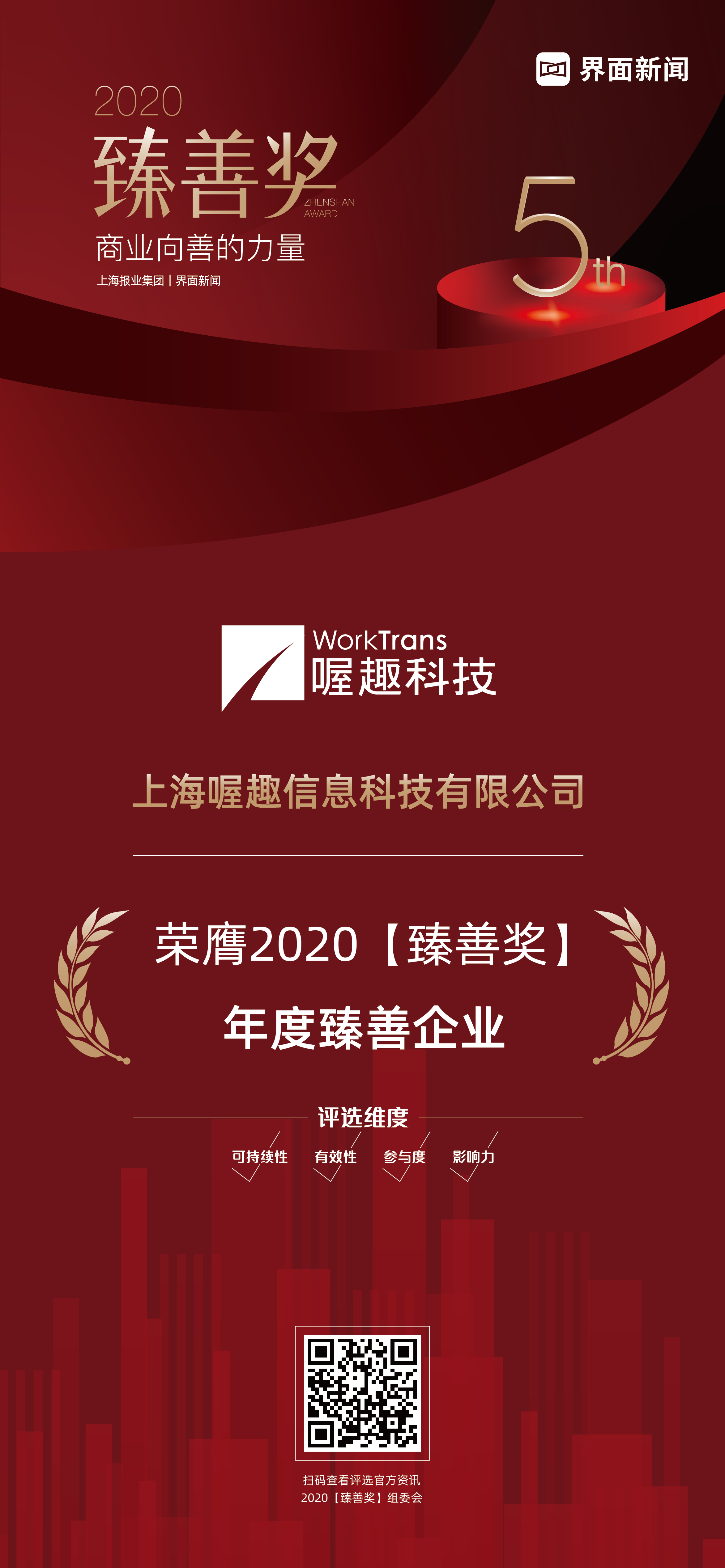 12月22日,上海报业集团l界面新闻在上海静安瑞吉酒店举办了2020【臻善奖】颁奖典礼,并正式公布了本年度获奖名单。围绕商业向善这一责任旨归,在公益慈善领域有所贡献的优秀企业踊跃参加。喔趣科技以卓越的CSR实践精神,荣膺年度臻善企业大奖。