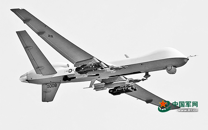 MQ-9“死神”无人机携带有多光谱瞄准系统和激光制导弹药的激光测距仪/指示器,机上装备6个武器挂架,可搭载包括“地狱火”导弹、GBU-38联合直接攻击弹药等近300千克炸弹。