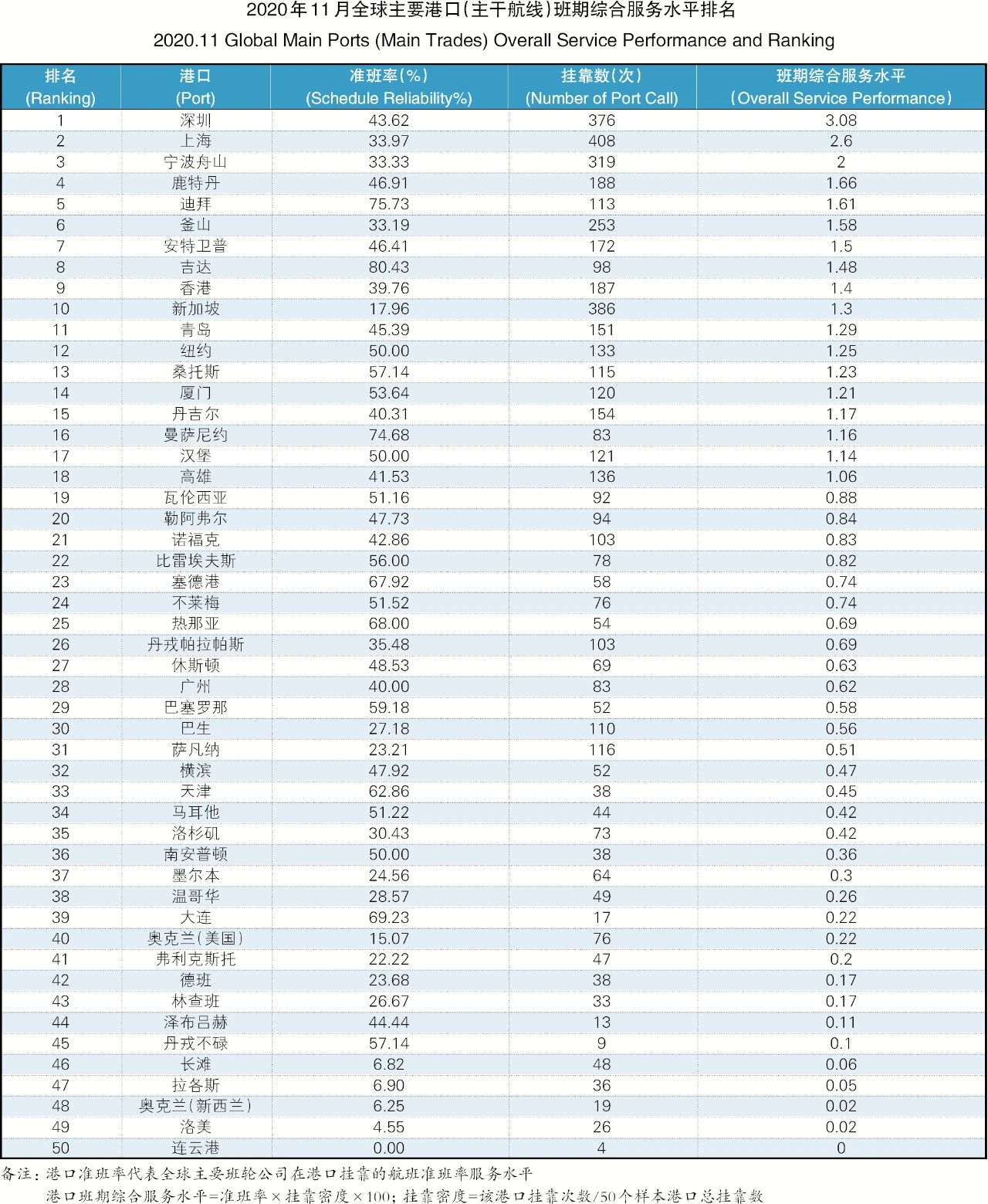 中国的深圳港、上海港、宁波舟山港在班期综合服务水平上位于前三位。