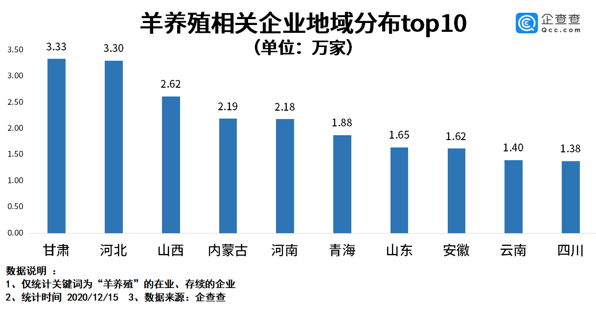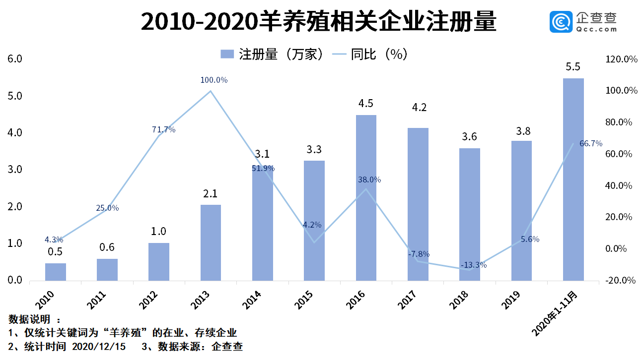 据农业农村部对全国500个集贸市场监测,2020年12月第二周,全国羊肉价格为每公斤82.66元,已连续八周上涨。我国是羊肉生产大国,羊养殖业近年来发展迅速。企查查数据显示,目前我国共有33.4万家羊养殖相关企业,甘肃、河北分别以3.33万家、3.30万家排名省份前两位。2019年,相关企业新注册量已达到3.8万家,今年前11月新注册5.5万家,同比增长66.7%。此外,全行业共有62%的企业注册资本低于100万。
