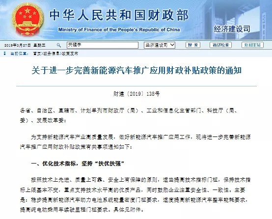 《关于进一步完善新能源汽车推广应用财政补贴政策的通知》,截图自中华人民共和国财政部官网