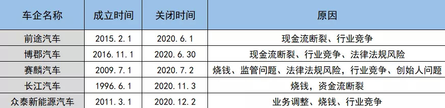 据IT桔子统计,2020年新能源造车死亡的企业名单中,不仅包括了去年就被曝已经出问题的长江汽车,同时众泰新能源、赛麟汽车、博郡汽车和前途汽车等新能源造车企业同样在这份名单上。
