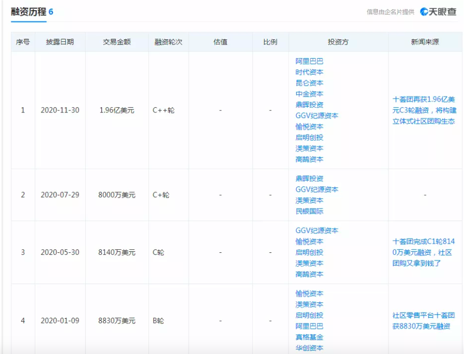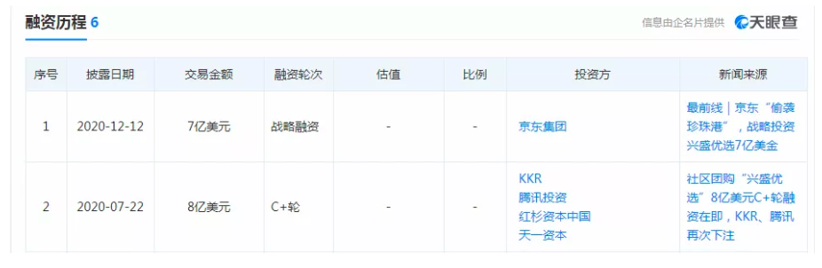 今年受疫情影响,社区团购的优势被放大,一级资本市场再次关注到社区团购行业。据天眼查APP显示,十荟团今年已经融资4轮,兴盛优选今年也有两轮高额融资。