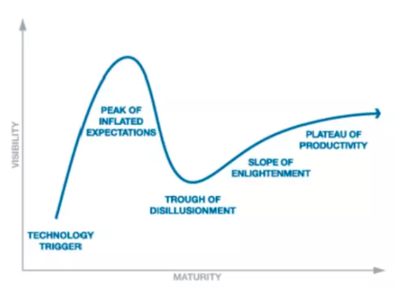 Gartner 公司将技术从出现到应用分为5个阶段,分别为萌芽期、过热期、低谷期、复苏期、成熟期,据此制成加德纳技术成熟曲线,根据此曲线可以判断新技术是否采用。