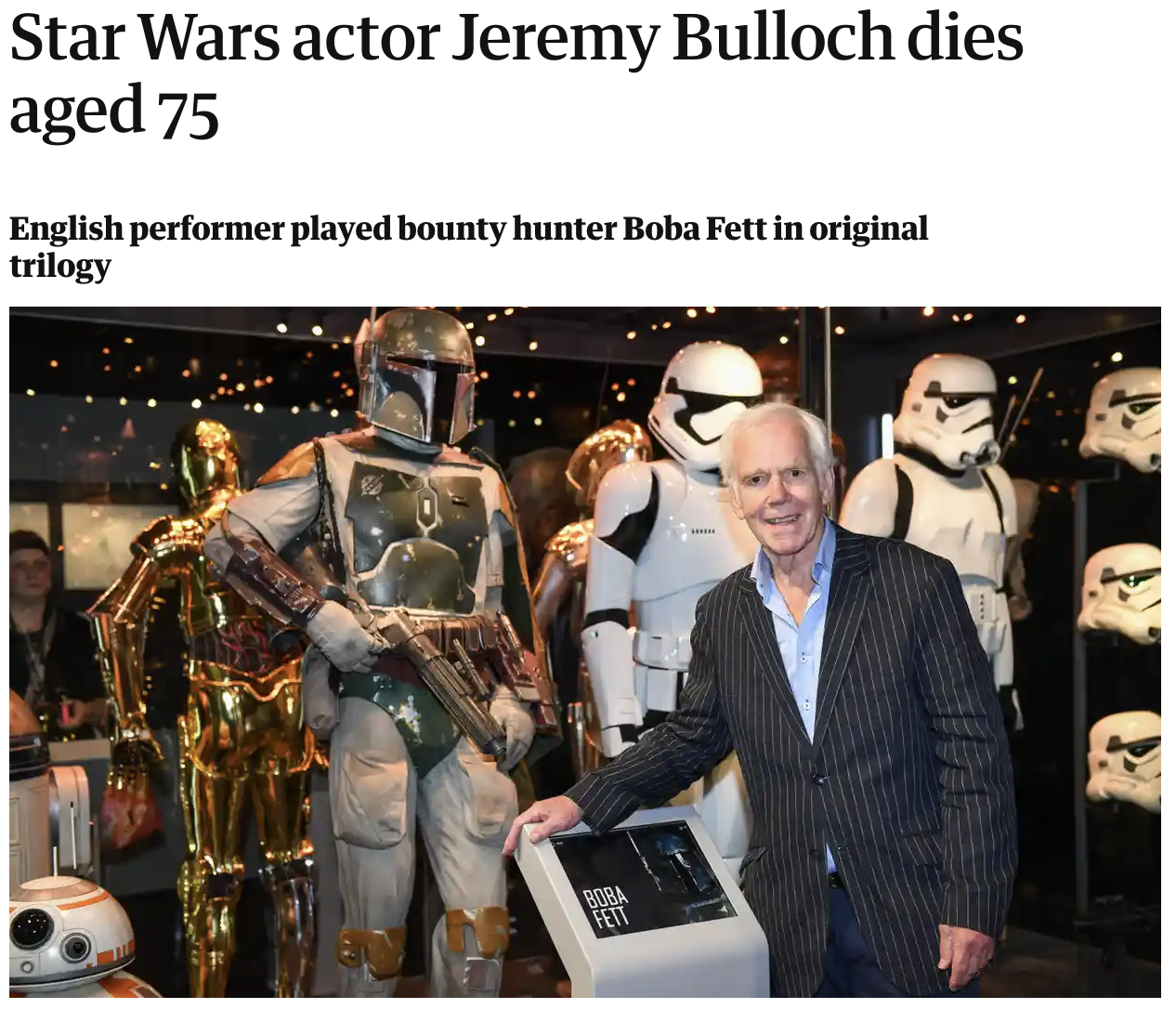 据英国《卫报》17日报道,《星球大战》系列电影中赏金猎人波巴·费特的扮演者、英国演员杰米·布洛奇(Jeremy Bulloch)周四因“多年帕金森病带来的健康并发症”于医院去世,享年75岁。