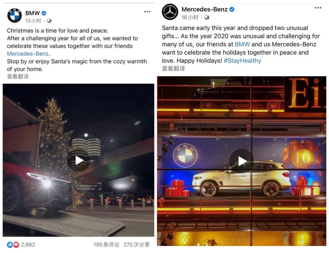宝马还发布了一条推文,大致内容为:“圣诞节是爱与和平的时刻,在经历了对我们所有人都充满挑战的一年之后,我们想和我们的朋友梅赛德斯-奔驰一起庆祝这些重要的事。也可以顺道拜访或是在家中舒适的温暖环境下享受圣诞老人的魔力。”奔驰对此发文回应:“我们的朋友宝马和梅塞德斯-奔驰希望在和平与爱中一起庆祝节日。”
