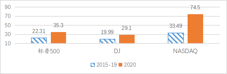 5、美股虹吸效应递减。美股价格如此之高,美国金融市场的虹吸效应进入边际递减区域。图3显示了截至2020年12月16日上午11时美国三大股指的P/E,可以看出已经远超2015-2019年的数值。尤其是NASDAQ的P/E高达74.5,在极度宽松的货币政策下,股市风险资产的年收益率被稀释至不足1.5%,股市价格的泡沫正在累积。