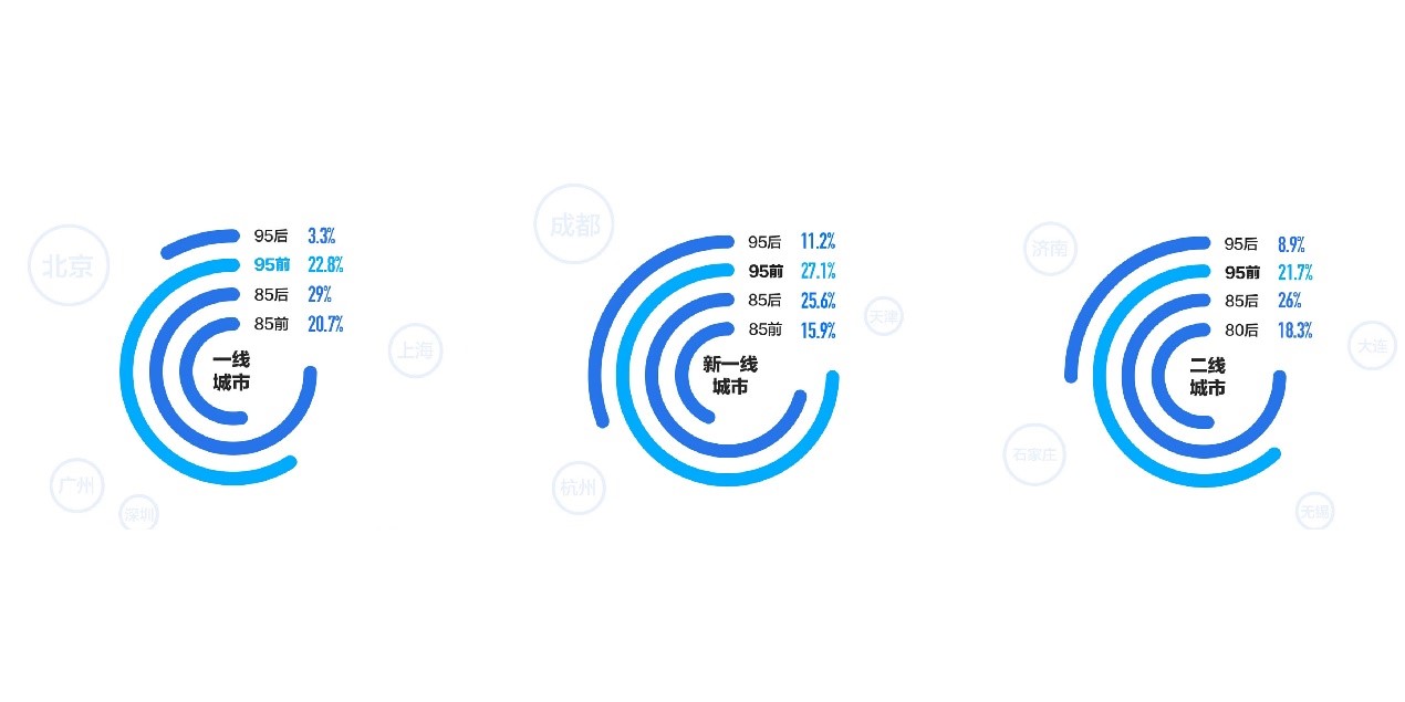 报告显示,2020年一线城市购房主力仍是85后,而在新一线及二线城市95前则分别以27.1%、21.7%的比例,拔得头筹,成为购房主力军。另外,最大不过25岁的95后,在新一线、二线城市的购房占比均超过80后,紧随85后之后悄然进场,成为购房新生力量。