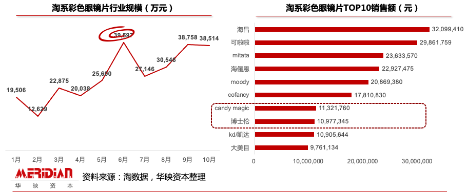 从行业规模来看,中国美瞳市场正在不断扩容。过往大家对美瞳市场的认知停留在十多亿规模的小赛道,但是仅从淘系渠道数据统计,2020年截止到目前淘系彩色眼镜销售额已达39亿元。我们认为,随着颜值经济的崛起,中国彩色隐形眼镜消费将保持更为快速的增长。