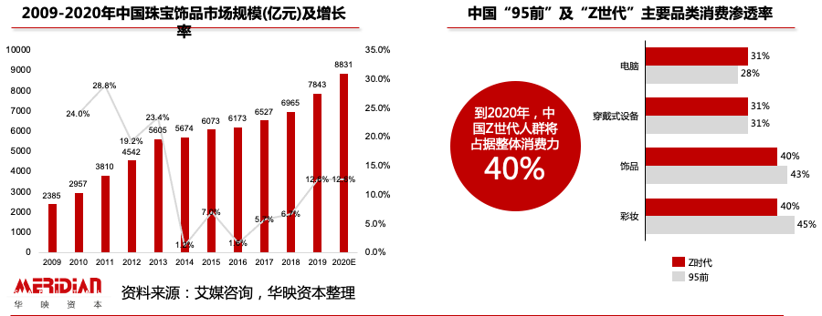 艾媒咨询数据显示,2019年中国黄金饰品市场规模为3667亿元,到2020年将达到3777亿元。珠宝饰品方面,2019年,中国珠宝饰品市场规模为7843亿元,同比增长率为12.6%。珠宝饰品在中国仍有较大发展空间。在千亿规模的市场中,中国Z世代人群据估计占据首饰行业整体消费力的40%。
