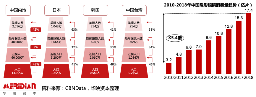 如果强调美瞳的医疗用品属性,美瞳作为视力矫正和替代框架眼镜的解决方案,在中国庞大的近视人群中,美瞳的渗透率仍有很大发展空间。据摩根斯坦利调研,中国是世界上视力矫正人口比例最高的国家,同时隐形眼镜配戴率仅有8%,远低于韩国(30%)、日本(32%)、中国台湾(34%),近视人群的美瞳需求仍待充分挖掘,未来想象力可观。