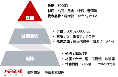 按客单价和材质差异划分,首饰市场主要有三大细分品类:珠宝,过渡首饰和配饰。