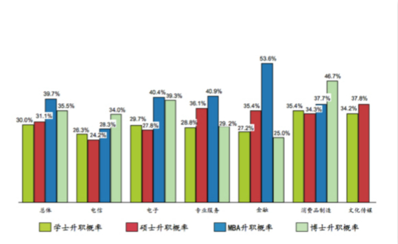 数据显示,在互联网行业,学历和升职概率呈正比,拥有MBA和博士学历的跳槽者晋升机会最多,硕士生则比本科生更有晋升优势。