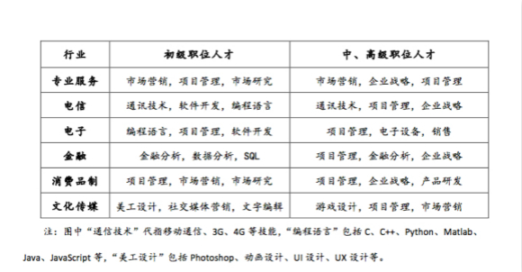 就各个人才群体的升职所需技能而言,初级职位人才大多依靠“老本行”获得晋升,例如专业服务行业的营销能力、电子行业的编程能力、金融行业的金融分析能力、文化传媒行业的文字编辑能力等。