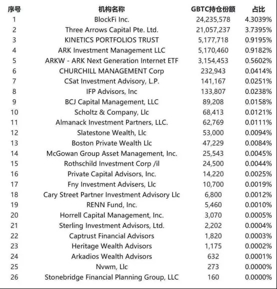 部分投资机构的GBTC持仓份额(数据源自:fintel,2020/11/30)