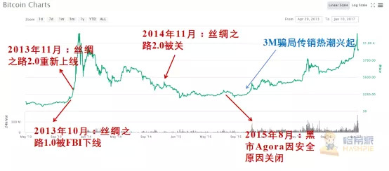 虽说丝绸之路的败露,一定程度上增加了政府干预比特币市场的力度;但是凭借着去中心化以及匿名性等等特点,之后几年时间里比特币依旧顺利游走于各个暗网市场,继续在黑色交易板块逐渐发展壮大。而且巧合的是,那时候头部黑色市场的迭代与衰败,都或多或少地引起了比特币的价格联动。