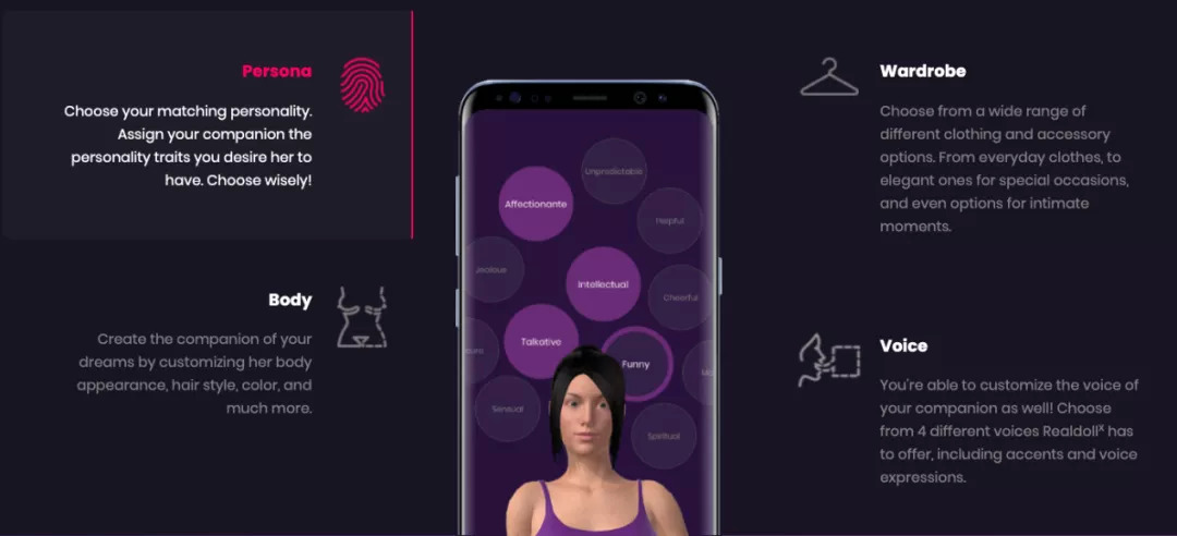 在宣传片中,“她”说:“我将会是你的完美伴侣,一切只为了你”。用户还可以通过AI软件来控制机器人的声音以及个性。