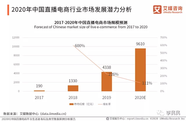 数据研究机构艾媒咨询提供的数据显示,2019年中国直播电商行业的总规模达到4338亿元。预计2020年中国在线直播的用户规模将达到5.24亿人,市场规模将突破9000亿元。市场规模体量倍数级增长的背后,是直播电商行业在不断夯实自身作为新兴商业模式的行业地位。