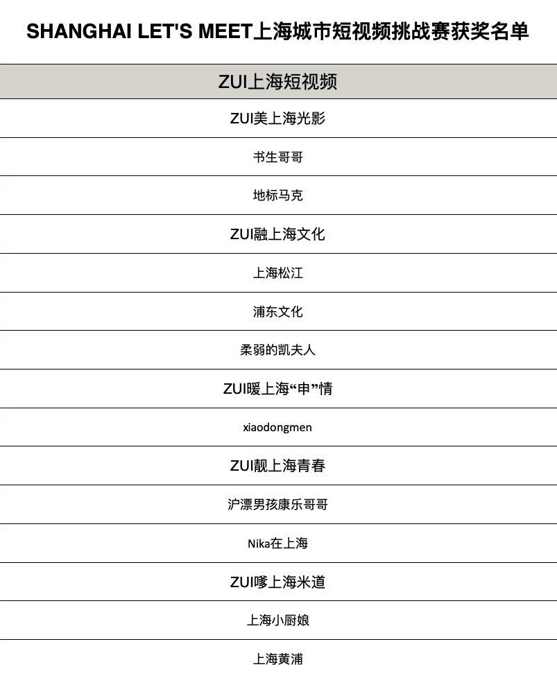 SHANGHAI LET’S MEET上海城市短视频挑战赛于日前落下帷幕。地标马克、柔弱的凯夫人、xiaodongmen、沪漂男孩康乐哥哥、上海小厨娘等网友创作的10部作品获“ZUI上海短视频”奖,即“ZUI美上海光影”、“ZUI融上海文化”、“ZUI暖上海‘申’情”、“ZUI靓上海青春”和“ZUI嗲上海米道”等五类。此外,上海宝爷、是豆包不是豆沙、隋奕军等网友创作的近百部作品获优胜奖。