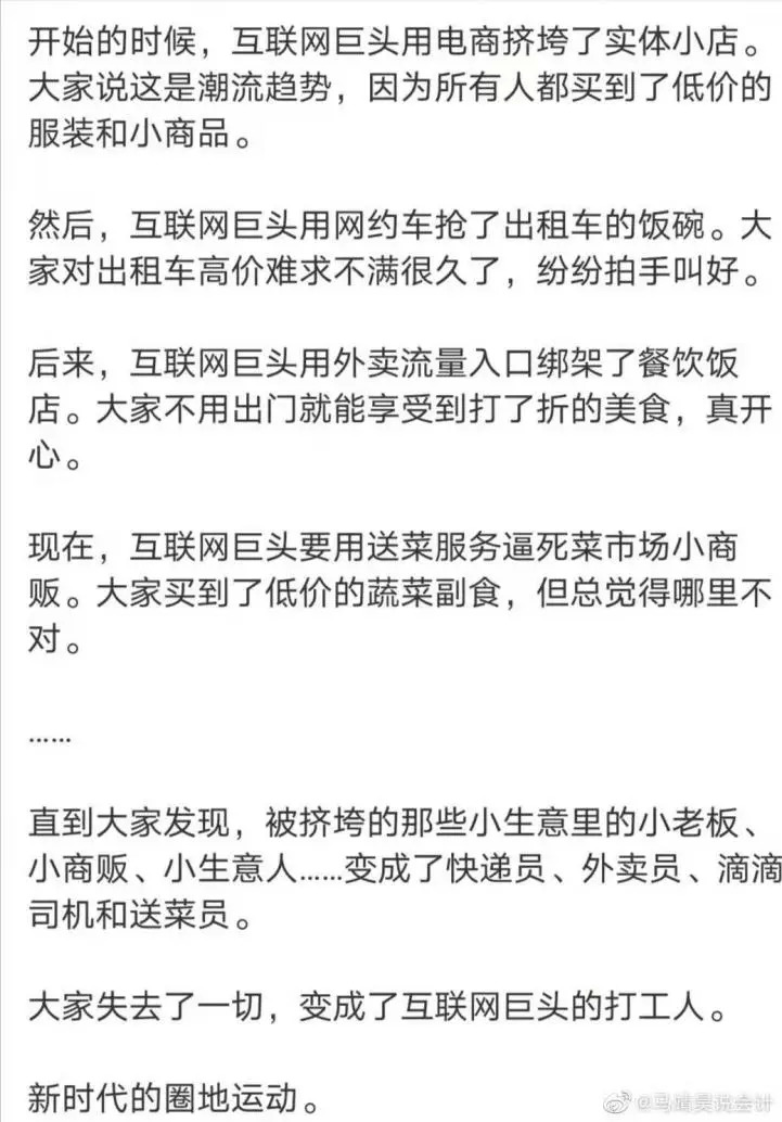 互联网行业每跨入一个传统领域,都会掀起一阵腥风血雨,这次也不例外,而且危及的是中国实体经济中,最为活跃和普遍的个体户。网上讨伐互联网卖菜的声音越来越多,我看到一段话让我至今印象很深: