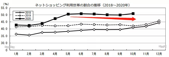 即使在疫情期间,选择网购的家庭占比增长到了50%,但这个数字在过去3个月就开始持平,没有进一步增长的趋势: