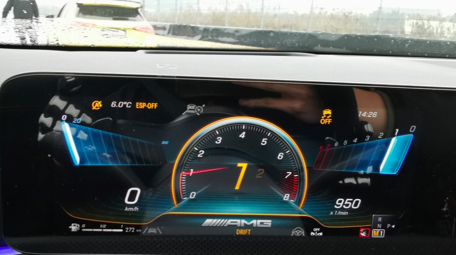 将驾驶模式调至“赛道模式”,长按ESP OFF三秒完全关闭,双手同时拨动方向盘两边的换挡拨片,并随后拨动“加档”拨片一次。极具仪式感的一番操作后,漂移(Drift)模式激活。