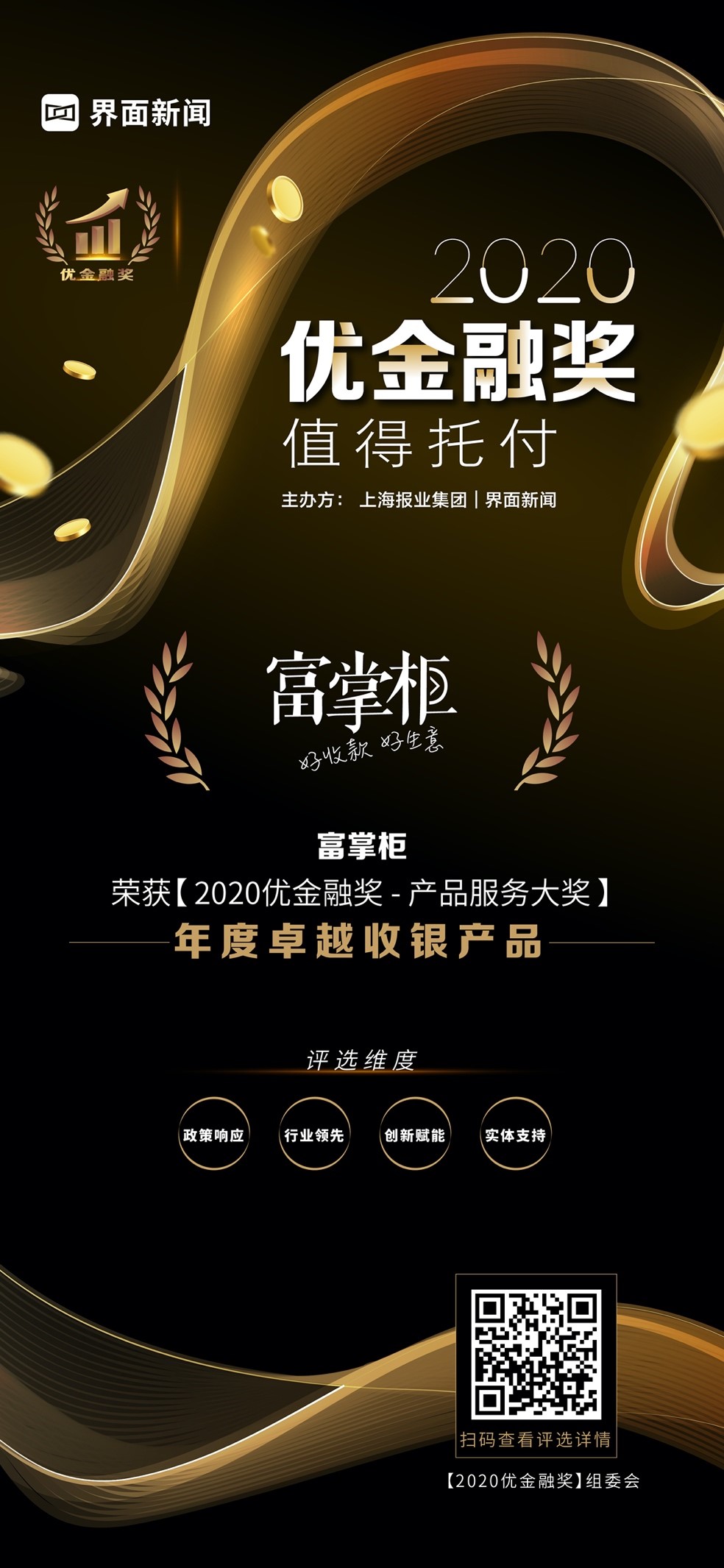 12月23日,上海报业集团l界面新闻在在上海静安瑞吉酒店举办了【2020优金融奖】颁奖典礼,并正式公布了本年度获奖名单。在这项万众期待的金融业年度评选中,来自银行、保险、证券、基金、信托、期货、投资、财管、金融科技的38家金融机构与企业,凭借年度市场表现与行业影响力,获得年度大奖。其中,富掌柜凭借其在行业内的优异表现,荣膺产品服务大奖——年度卓越收银产品。