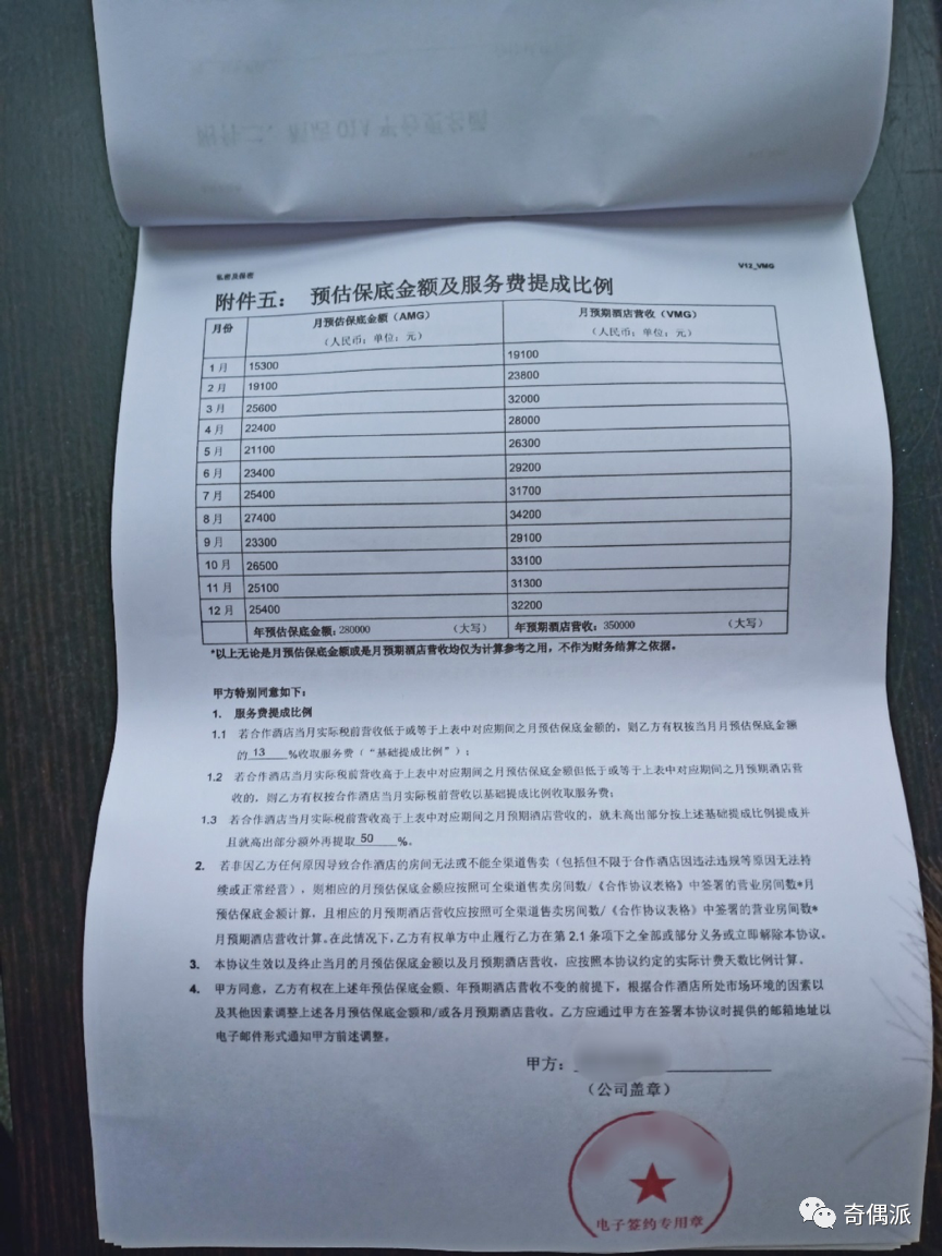 另外,在结佣合规中有说明,月账单出具后7天内,合作酒店必须结清佣金,超过7天未结清的,OYO有权在合作协议的收佣率上增加1%;超过30天未结清,OYO方有权单方面终止合作协议中的保底条款。