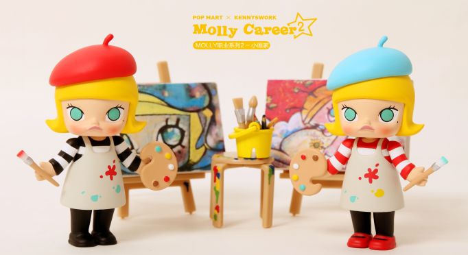Molly是香港的知名设计师Kenny Wong的作品,原型是一个傲娇又才华横溢的小画家。在和泡泡玛特达成合作之前,Molly已经是一个身份形象百变的知名玩偶了,但Molly始终不变的就是她那撅起的小嘴和冷酷的表情。