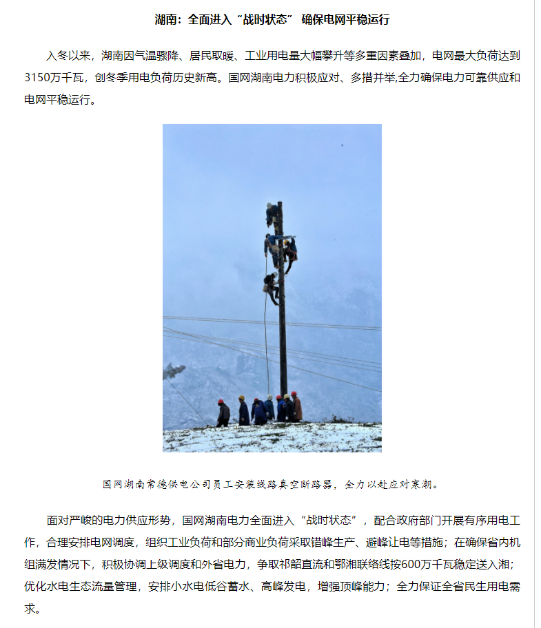 12月19日,国家电网有限公司官方网站消息,入冬以来,湖南因气温骤降、居民取暖、工业用电量大幅攀升等多重因素叠加,电网最大负荷达到3150万千瓦,创冬季用电负荷历史新高。国网湖南电力积极应对、多措并举,全力确保电力可靠供应和电网平稳运行。