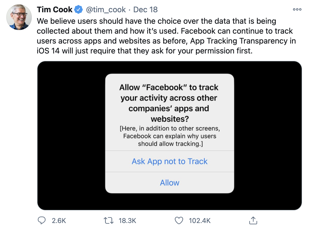 12月19日消息,苹果首席执行官蒂姆·库克(Tim Cook)当地时间18日在推特发文称:“用户应该对正在收集的关于他们的数据以及如何使用这些数据有选择权。Facebook可以像从前一样继续跨应用和网站跟踪用户,iOS 14中的应用追踪透明功能只需要他们先征得用户的同意。”