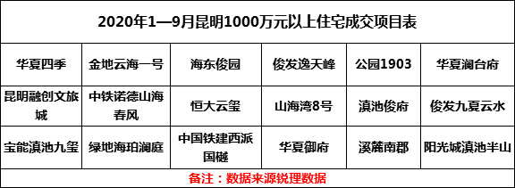 根据锐理数据,今年1—9月,昆明有18个项目成交了价格在1000万元以上的住宅,总成交153套。从价格方面来看,成交均价最高的是阳光城滇池半山,均价52200元/㎡;其次是金地云海一号项目,均价50661元/㎡。