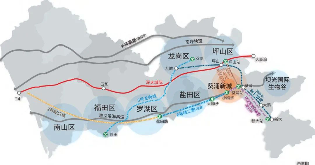 不仅可通过大鹏大道链接葵涌中心区,直达坝光国际生物谷,还可通过南坪快速速达深圳中心区,未来可通过龙大城际(规划中,起点龙城站、终点新大站)快速通达前海,深圳T4机场。(注:龙大城际计划2020年底开工,设龙城、坪山、葵涌、大鹏、新大等5座车站,轻松串联前海)