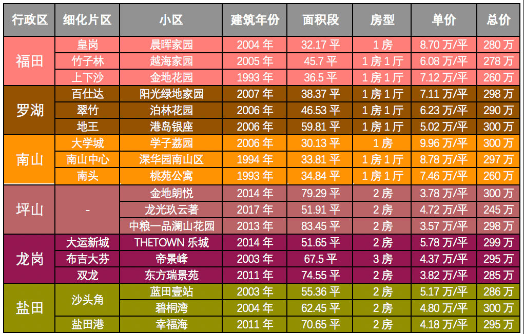 前两天,特地梳理了一下总价200万-300万之间在福田、罗湖、南山、坪山以及盐田可买的房子(二手房),如下:(部分房源,仅作参考)