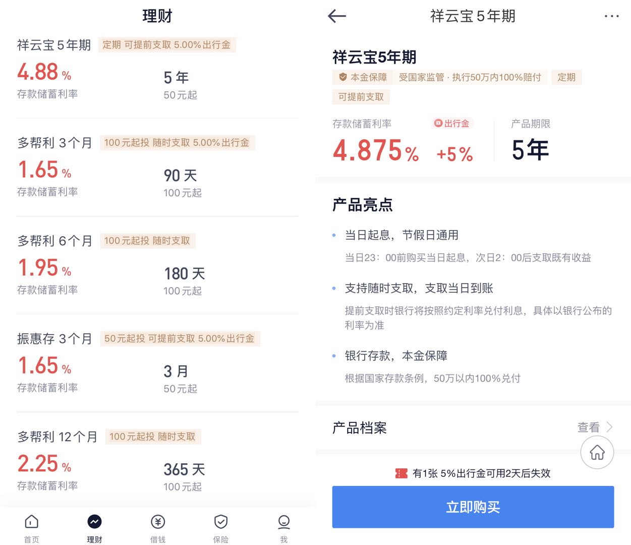 另外,界面新闻记者下载滴滴金融App注册后发现,在该平台的理财栏目里,互联网存款产品仍在正常销售,合作的银行包括武汉众邦银行、辽宁振兴银行、营口沿海银行,起投金额为50元,存款储蓄年化利率最高为4.875%,最低为1.65%,存款期限从7天至5年不等。