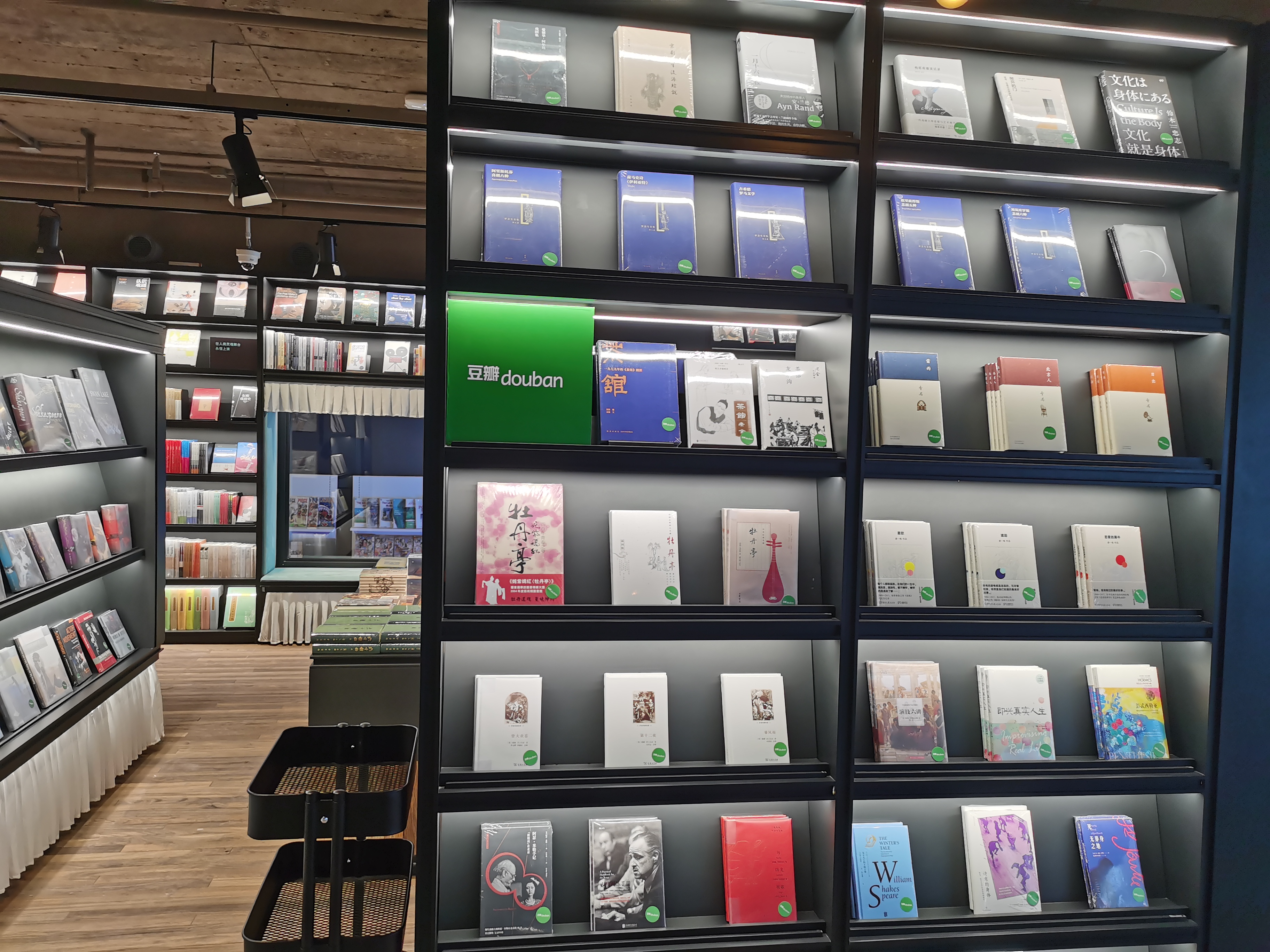 步入店内看到的第一个名为“戏剧”的书架上不仅有《西厢记》《长生殿》等古典巨著,也摆放有老舍的《四世同堂》,向内依次转换为古希腊悲喜剧、莎士比亚喜剧、悲剧以及易卜生戏剧。据书店工作人员介绍,书店展陈主要以戏剧发展时间线为脉络,因此读者在店内可以浏览从早期戏剧的诞生到现代、当代戏剧的主要流派及重要作品。